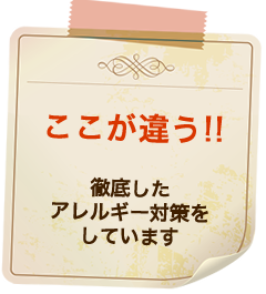 特定原材料等が意図せずして最終製品に混入してしまうことを防ぐためにアレルギー対策品の製造は完全別工程にて行っております。