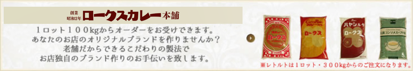ロークス本舗は、創業開始の昭和2年より、直火焙煎にこだわり、丁寧に作り続けてまいりましたカレー粉を始め、ルウ関連商品、レトルト商品、調味料、アレルギー対応食品等、日本の食産業に関連する商品を製造して参りました。
